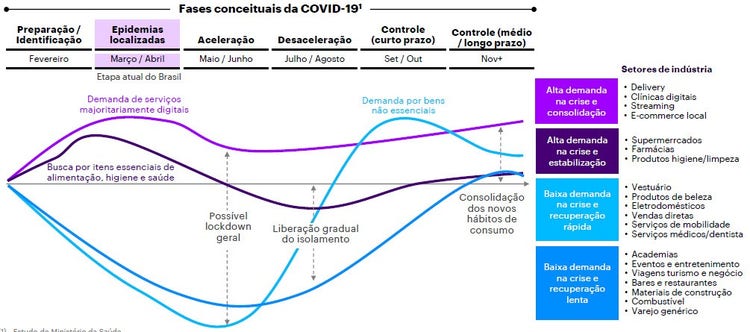O estudo também projeto a recuperação da economia de forma distinta. Os setores de vestuário, produtos de beleza, eletrodoméstico, vendas diretas, serviços de mobilidade e serviços médicos, hoje em baixa demanda, deverão se recuperar em um ritmo mais avançado. Já os serviços de academias, eventos, turismo, bares e restaurantes, deverão avançar um ritmo mais lento.
