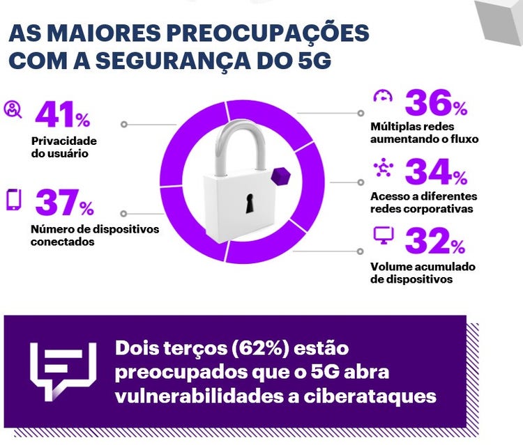 No entanto, esse otimismo não elimina as preocupações de segurança em torno do 5G, que cresceram em comparação com o ano passado. Especificamente, mais de um terço (35%) dos participantes da pesquisa recente expressou preocupações em relação à segurança do 5G, em comparação com 32% na pesquisa do ano passado. Além disso, mais de seis em cada 10 entrevistados (62%) na pesquisa recente expressaram temores de que o 5G os torne mais vulneráveis a ataques cibernéticos, e as empresas acreditam que a maior parte do risco começará no nível do usuário, seja por meio dos dispositivos ou de pessoas.