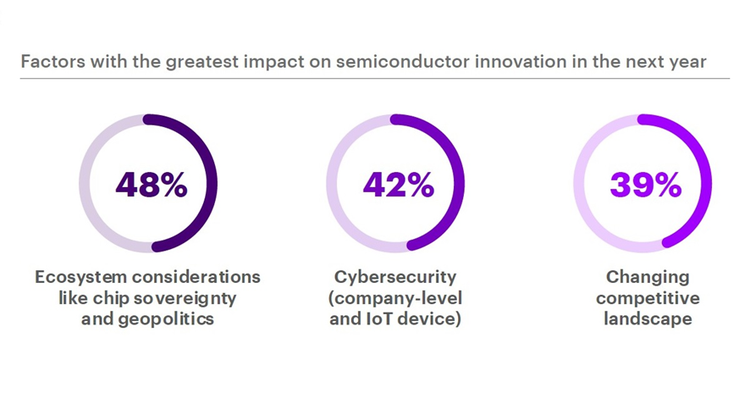Os entrevistados citaram desafios que poderiam afetar a capacidade de inovação de suas empresas, mesmo com a diminuição dos efeitos prolongados do COVID-19 na cadeia de suprimentos, incluindo geopolítica (apontada por 48% dos entrevistados), ameaças de segurança virtuais (42%), mudanças no cenário competitivo (39%) e escassez de talentos (35%). Diante das constantes transformações no setor, 65% dos executivos acreditam que a taxa da lei de Moore – que prevê que o número de transistores em um circuito integrado dobra aproximadamente a cada dois anos – diminuirá até 2024. Além disso, 56% acreditam que promover forte proteção e aplicação de PI é uma das melhores formas de aumentar a resiliência do setor no futuro.